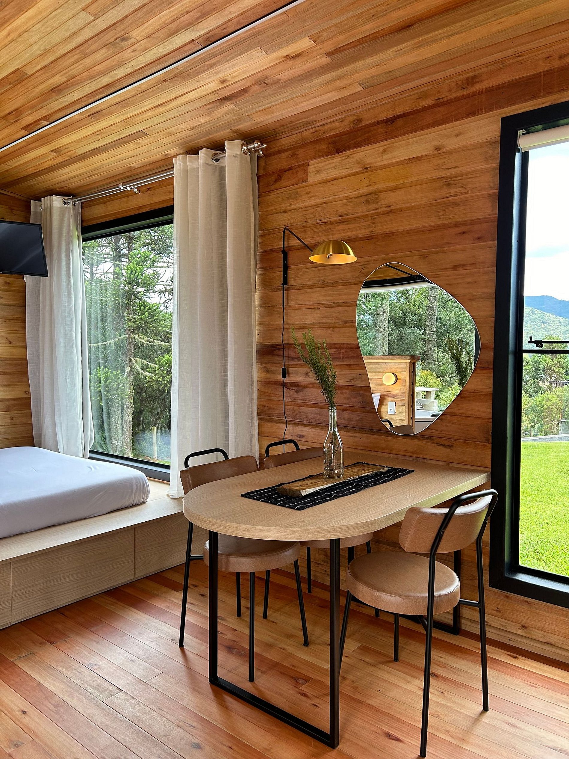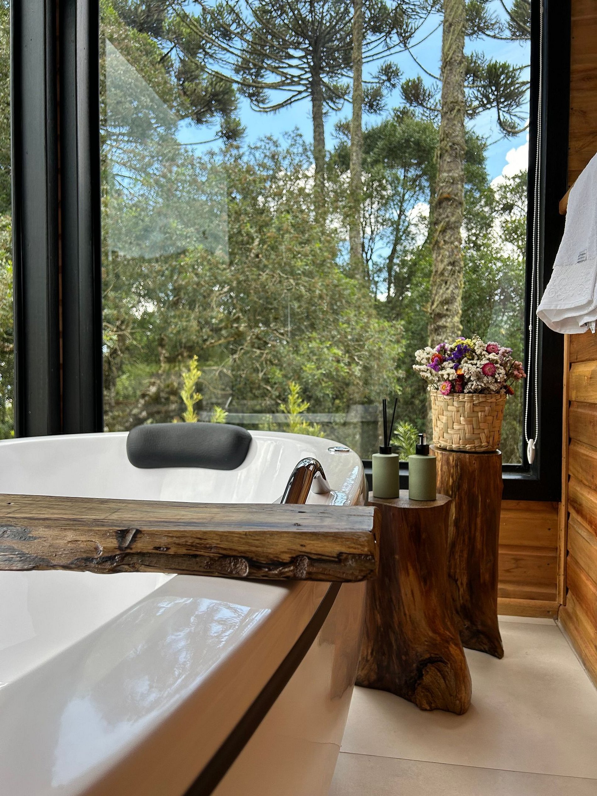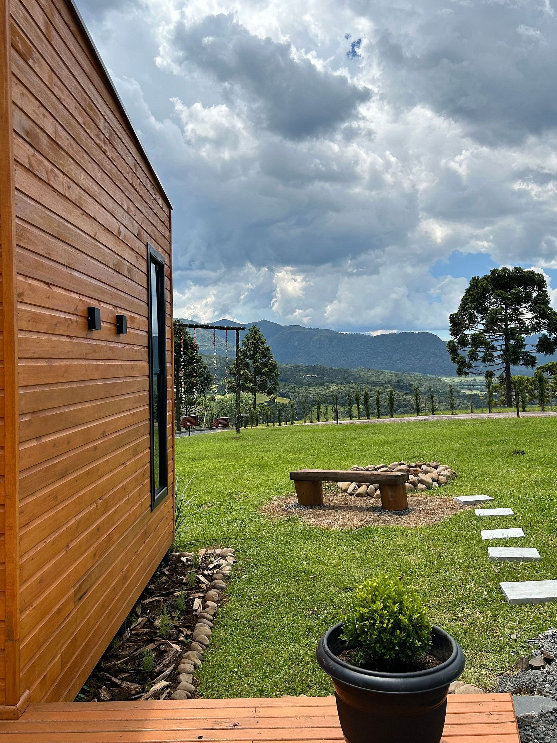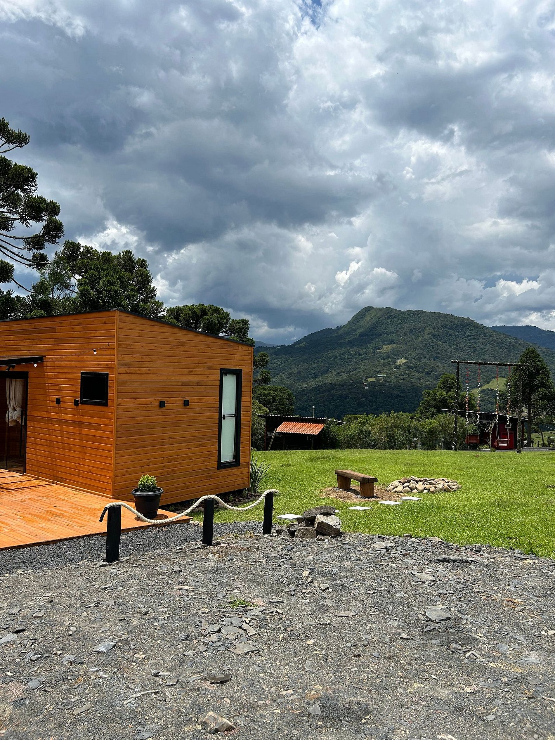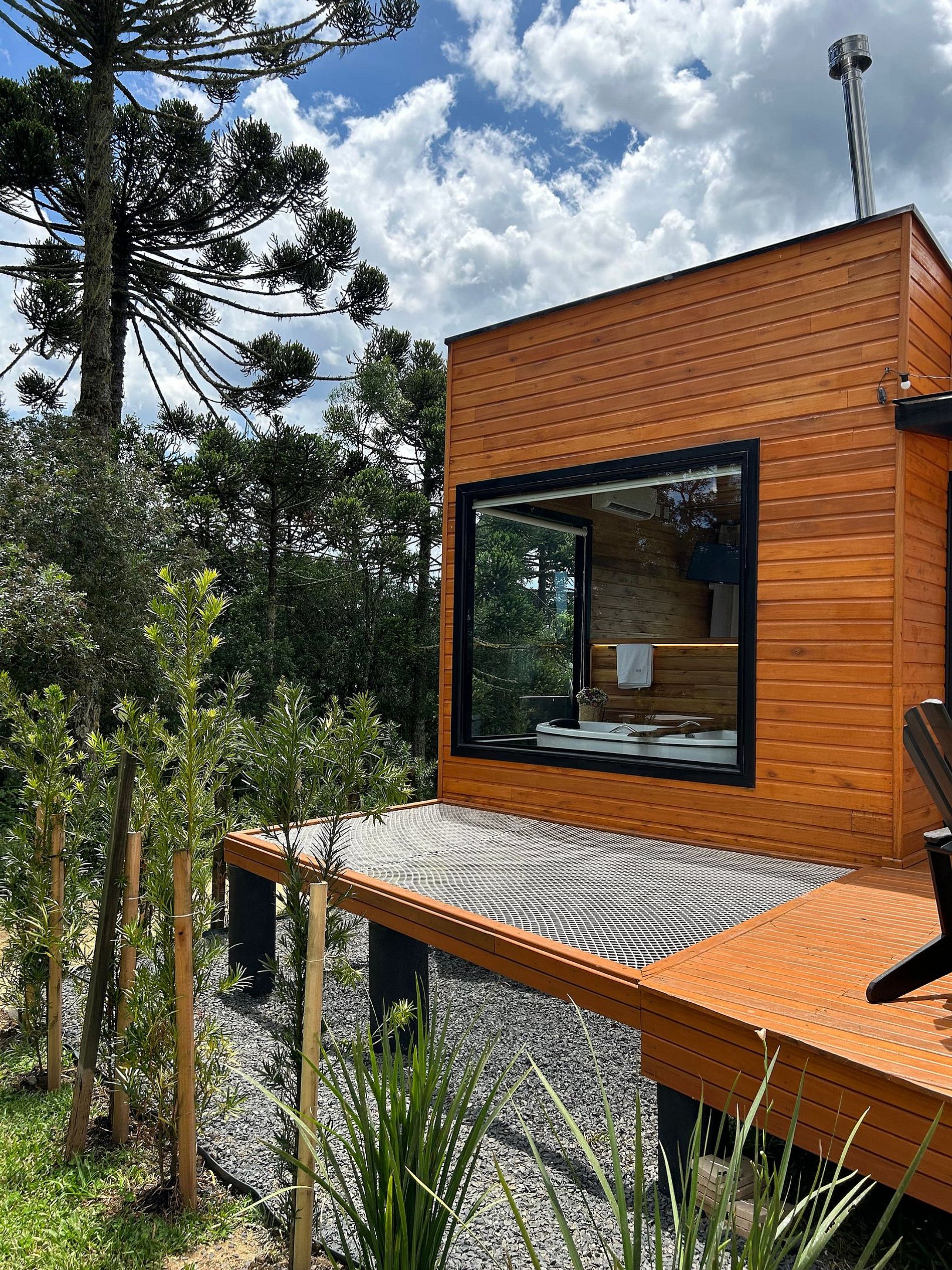 O chalé está posicionado em área de 8.000m2, com imenso gramado. Nesse espaço há, ainda, churrasqueira rústica, o Balanço da Liberdade e o deck exclusivo, com poltronas de madeira, incluindo um kit para a experiência de seu acendimento, com lenha, gravetos, acendedor e isqueiro.