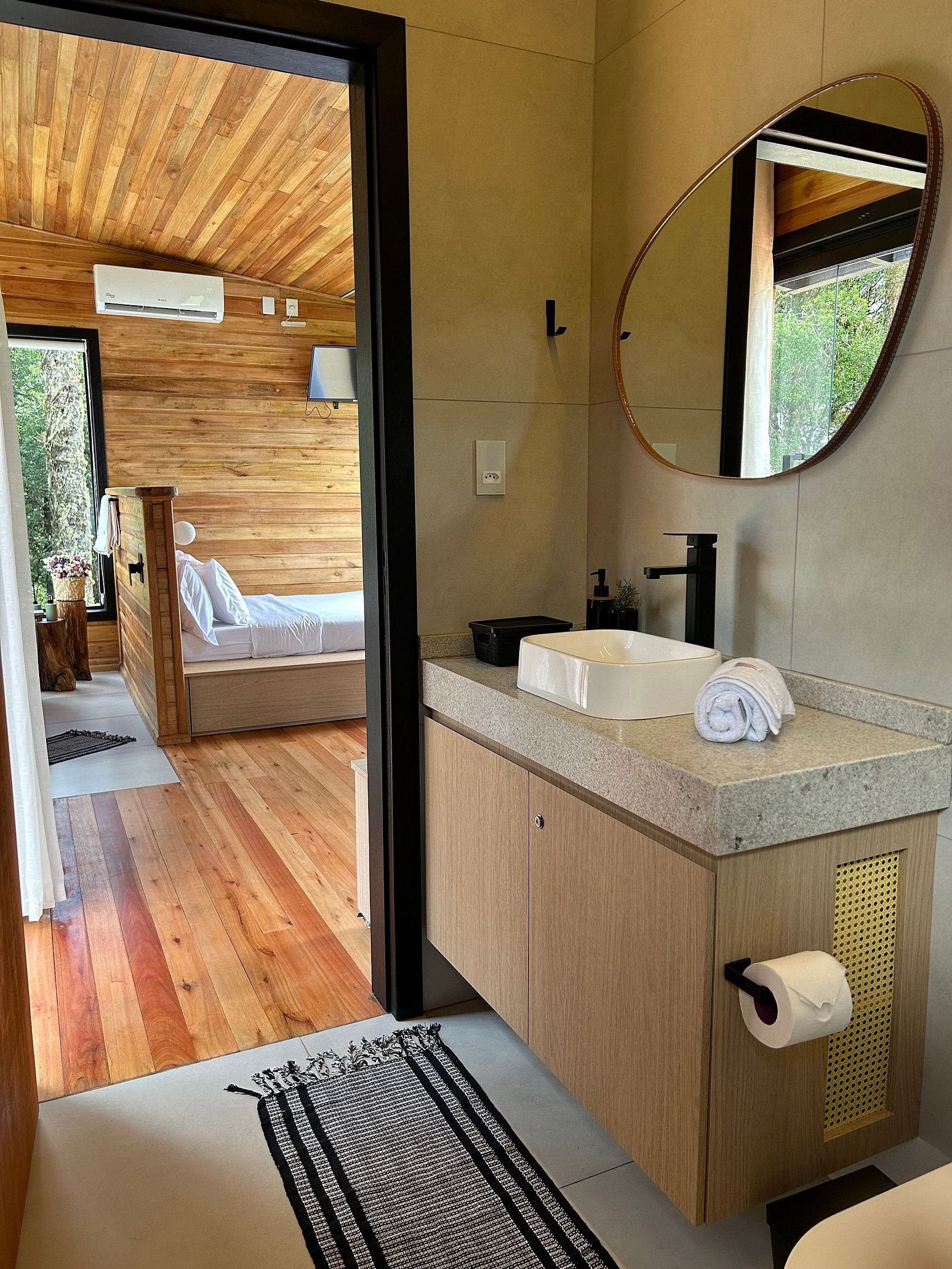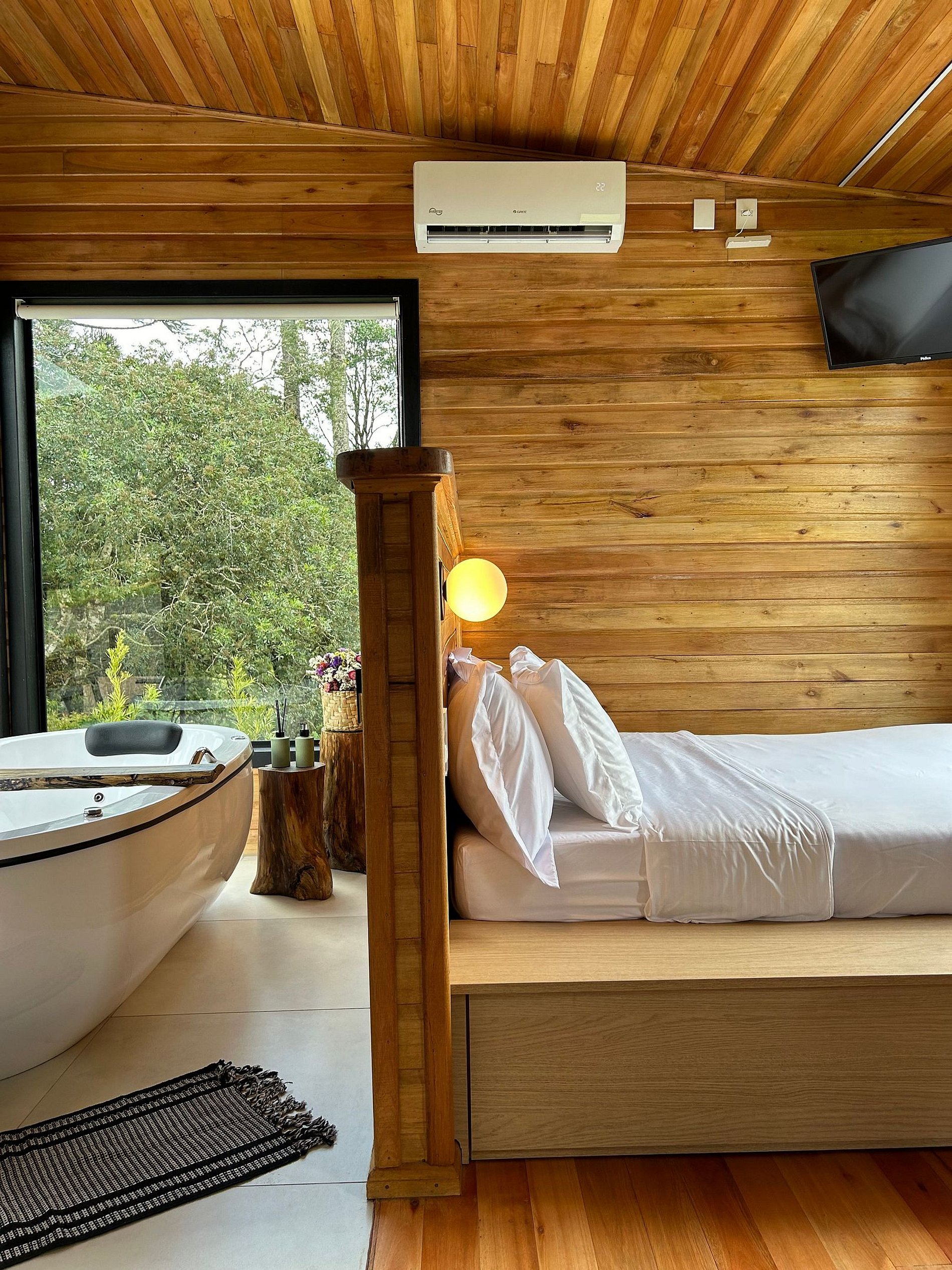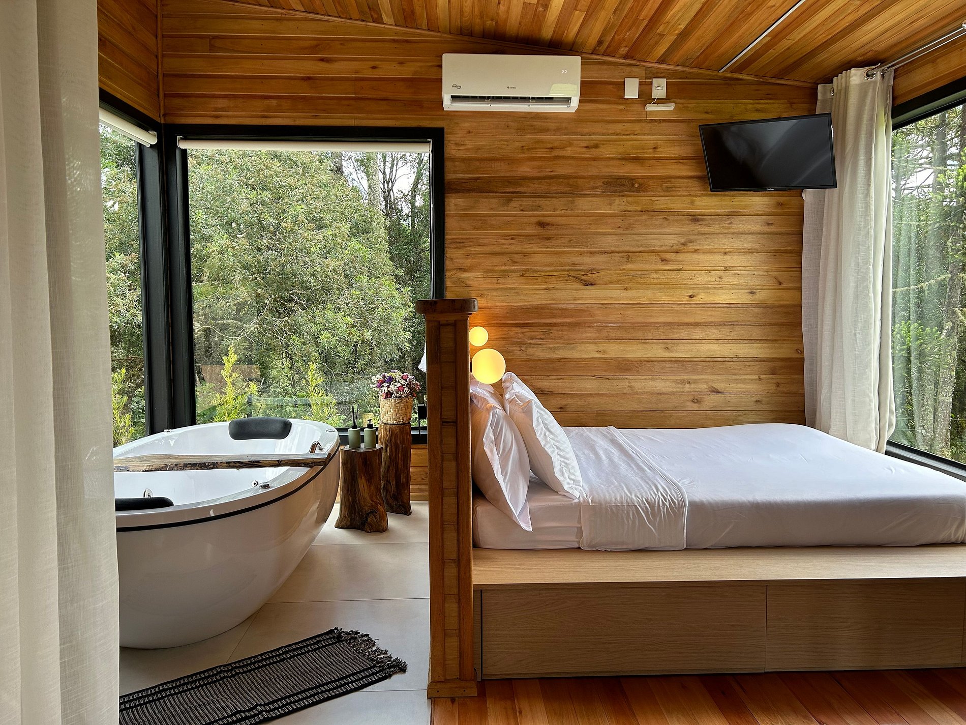 Chalé moderno e aconchegante, imerso na exuberância da natureza de Urubici, na Serra Catarinense. Conforto, privacidade e segurança. Equipado com banheira de hidromassagem, lareira, ar condicionado, TV, Netflix, Alexa, cama de casal, bicama com colchão de solteiro, frigobar, microondas, cozinha compacta completa, Wi-Fi e uma vista de tirar o fôlego. Acomodação perfeita para casais ou até 3 pessoas. Possui deck ao ar livre, com poltronas de madeira para relaxamento, diversão e contemplação.